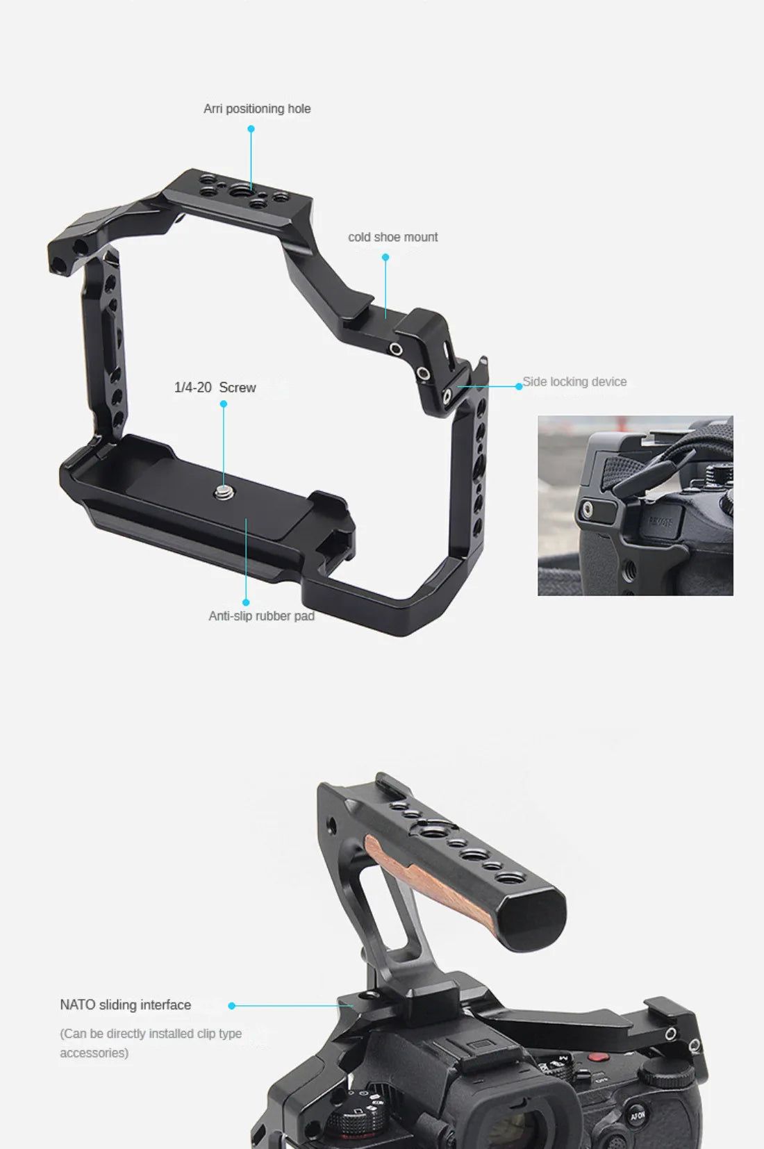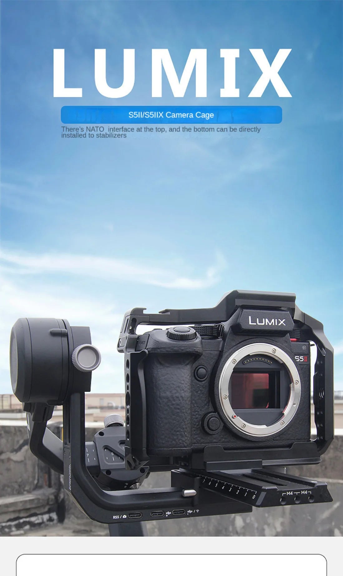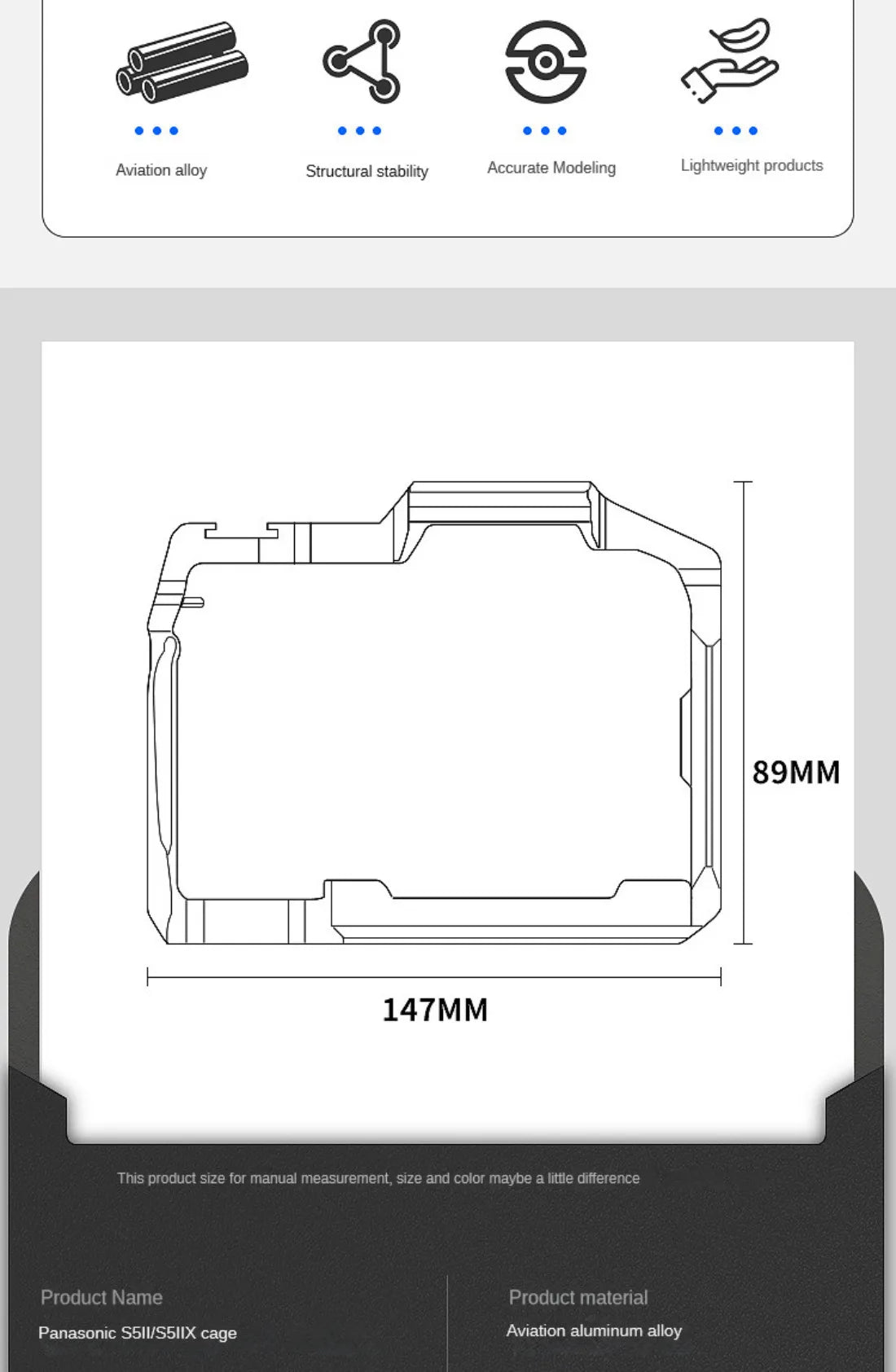 This Panasonic Lumix S52 cage is made from high-quality aluminum, the full cage is durable and lightweight, making it easy to carry around during shooting.