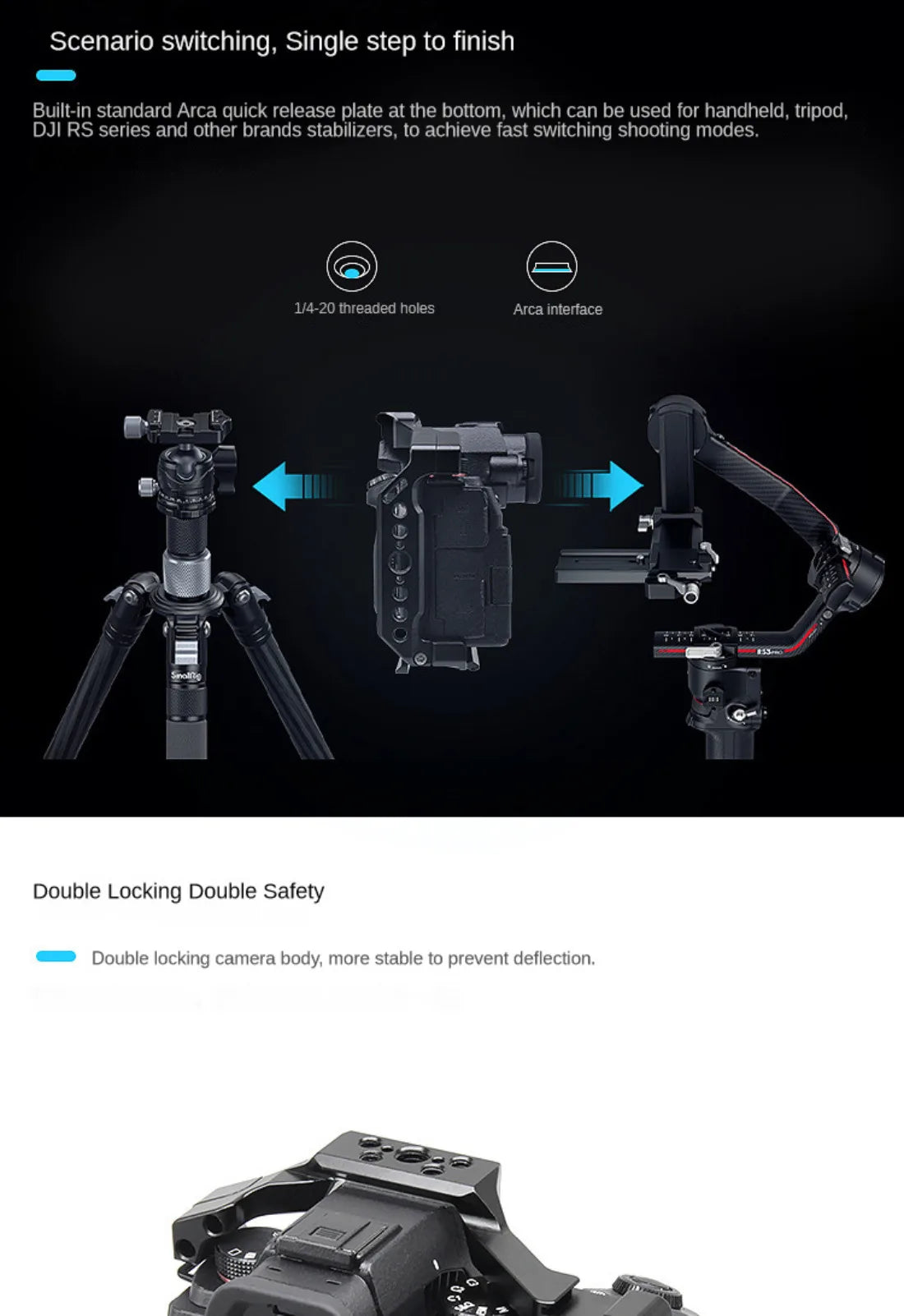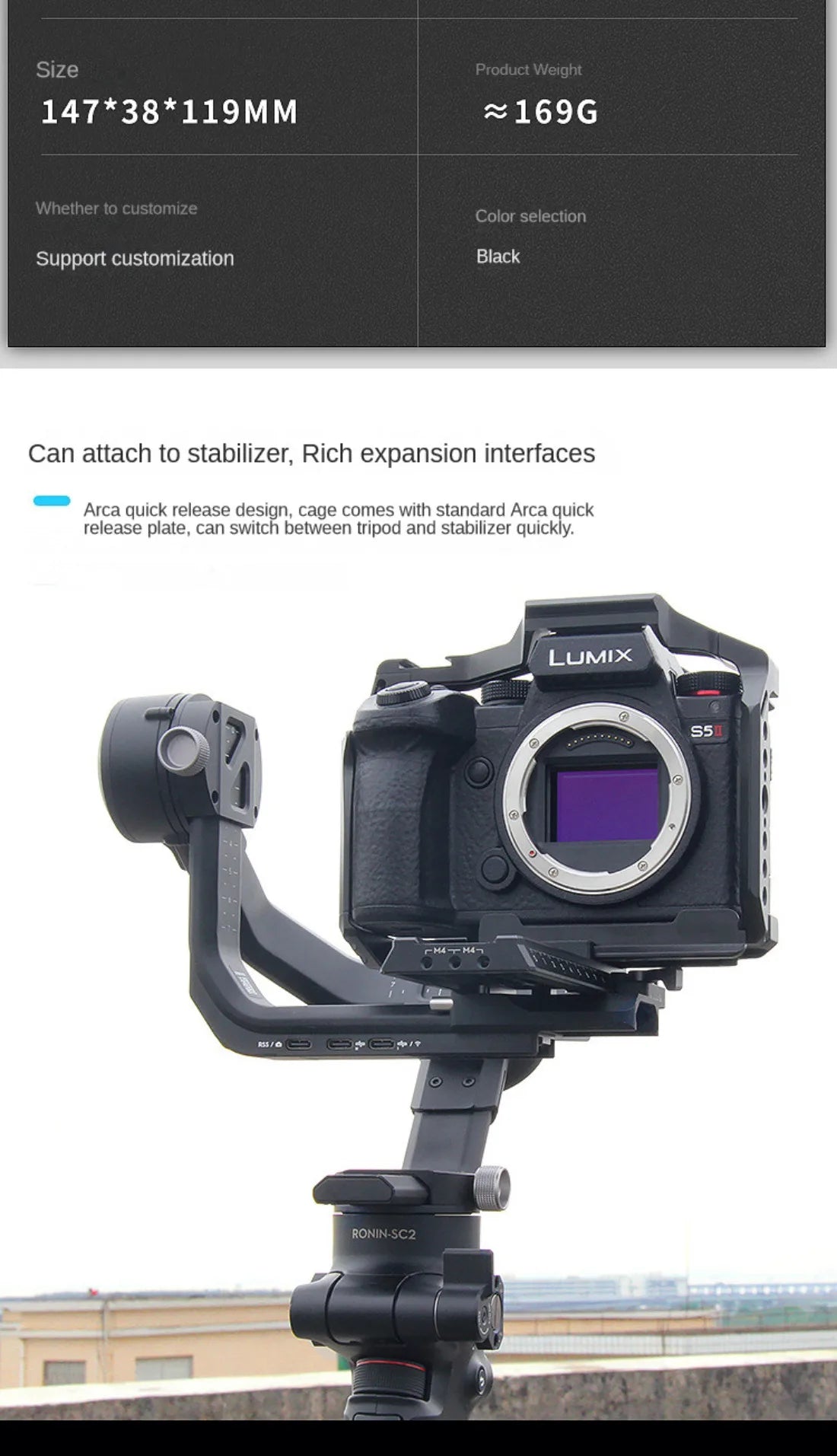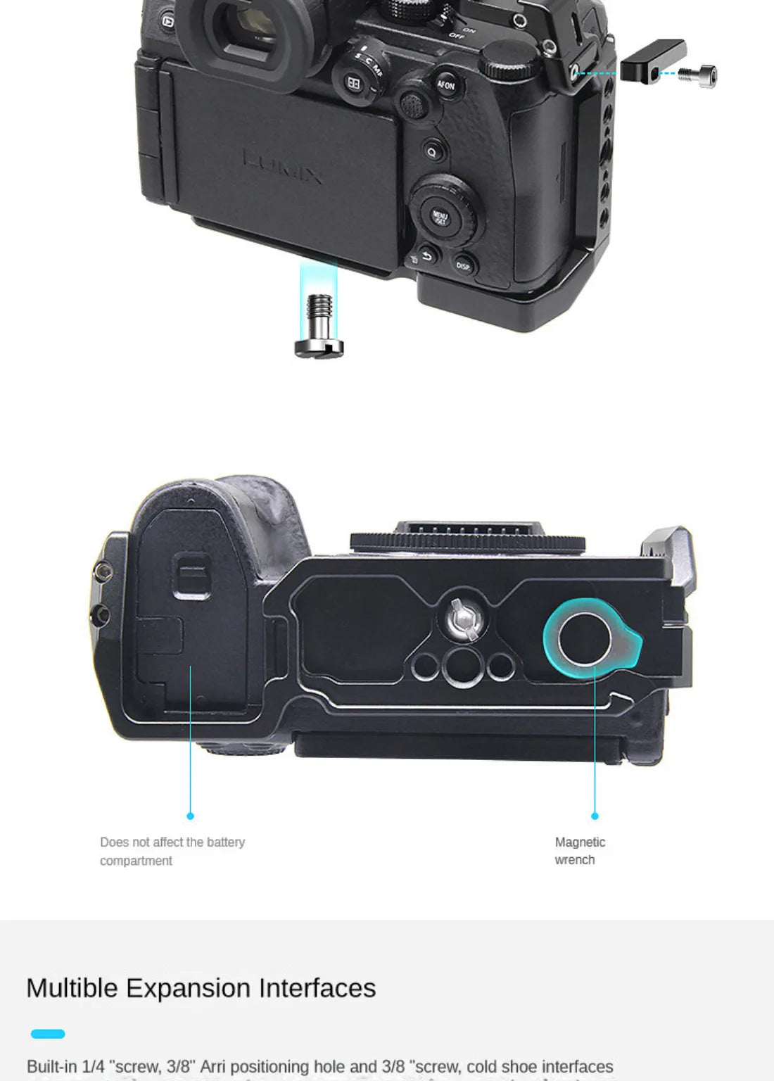 This Panasonic Lumix S52 cage is made from high-quality aluminum, the full cage is durable and lightweight, making it easy to carry around during shooting.